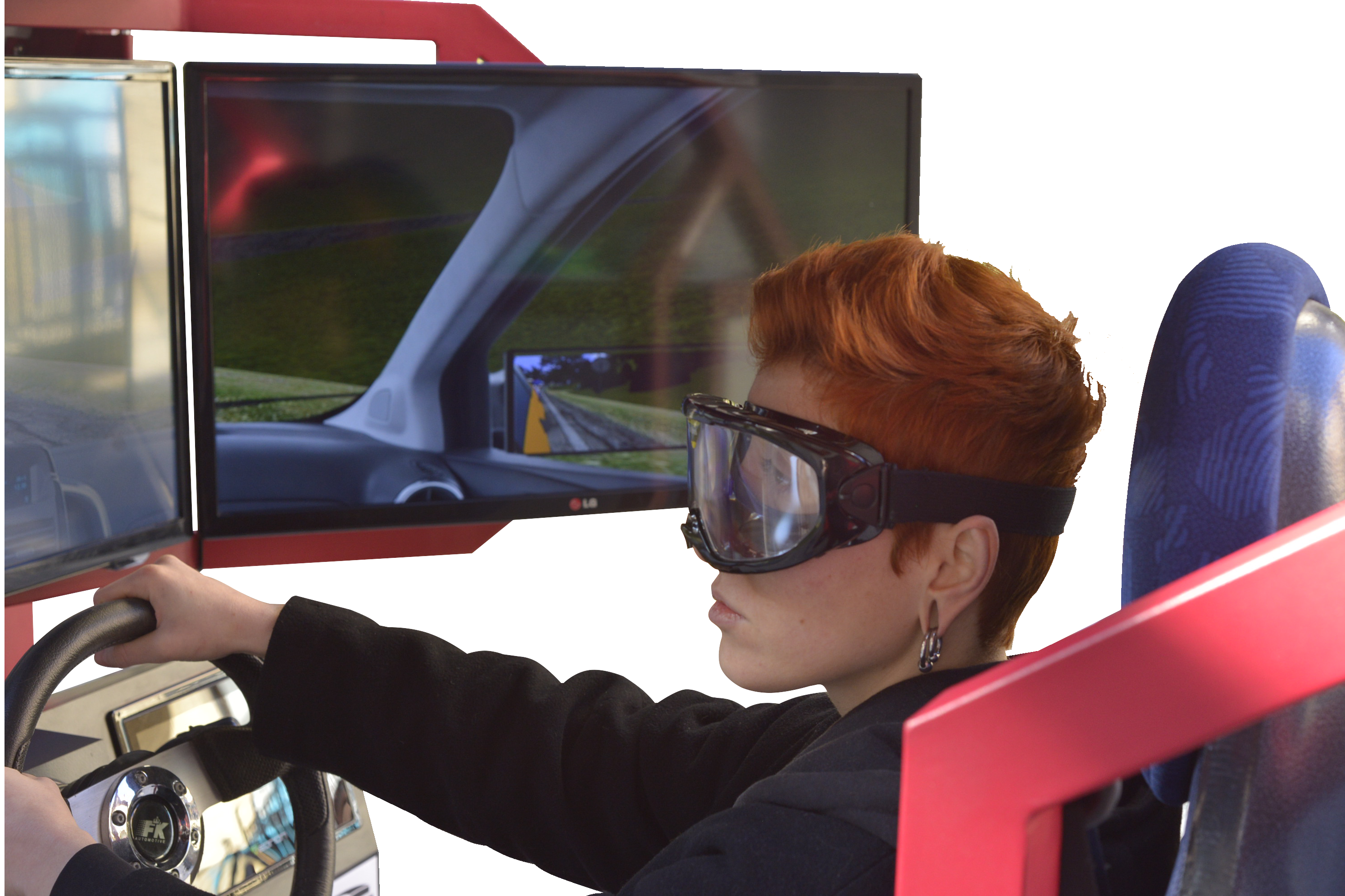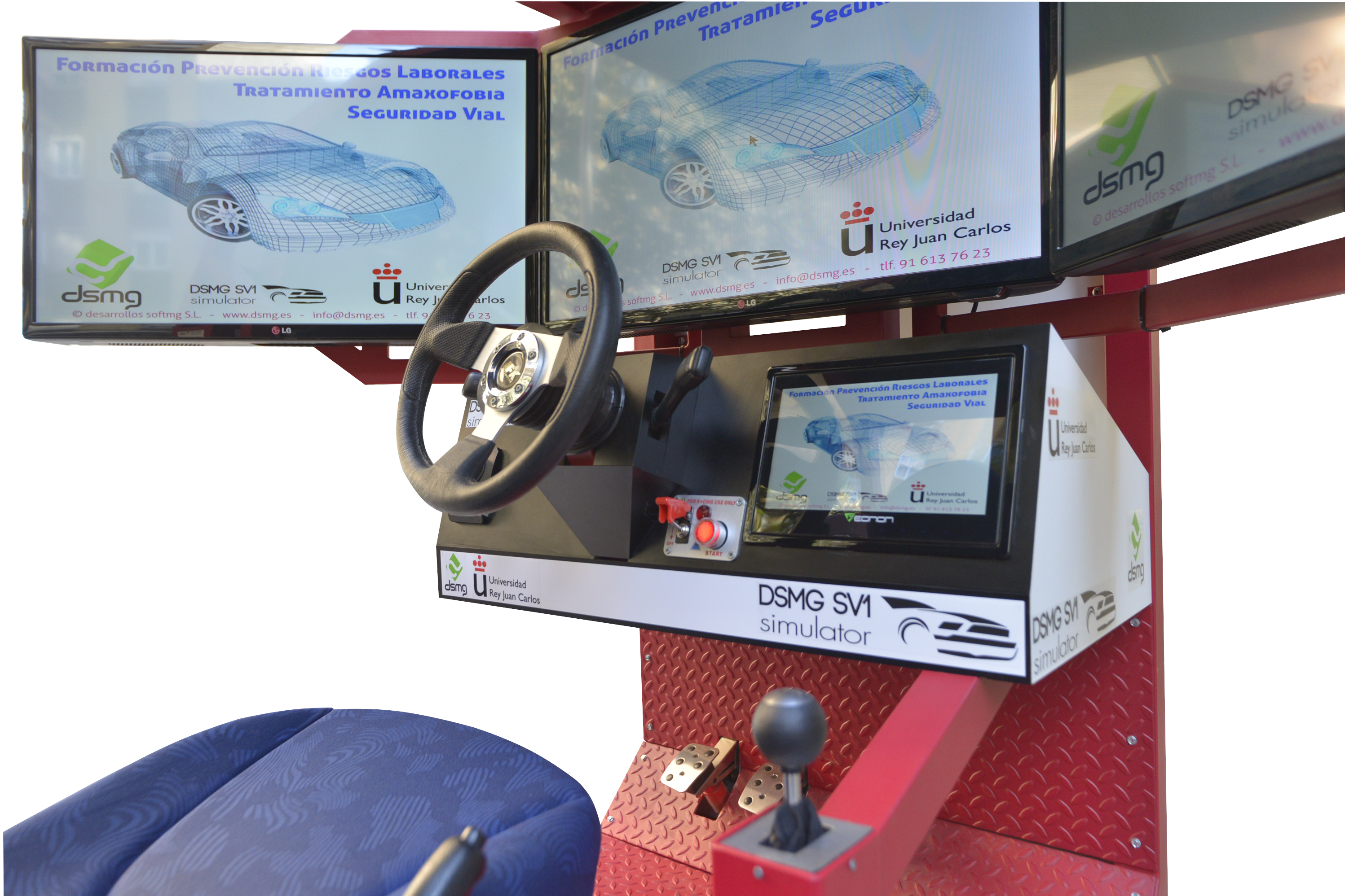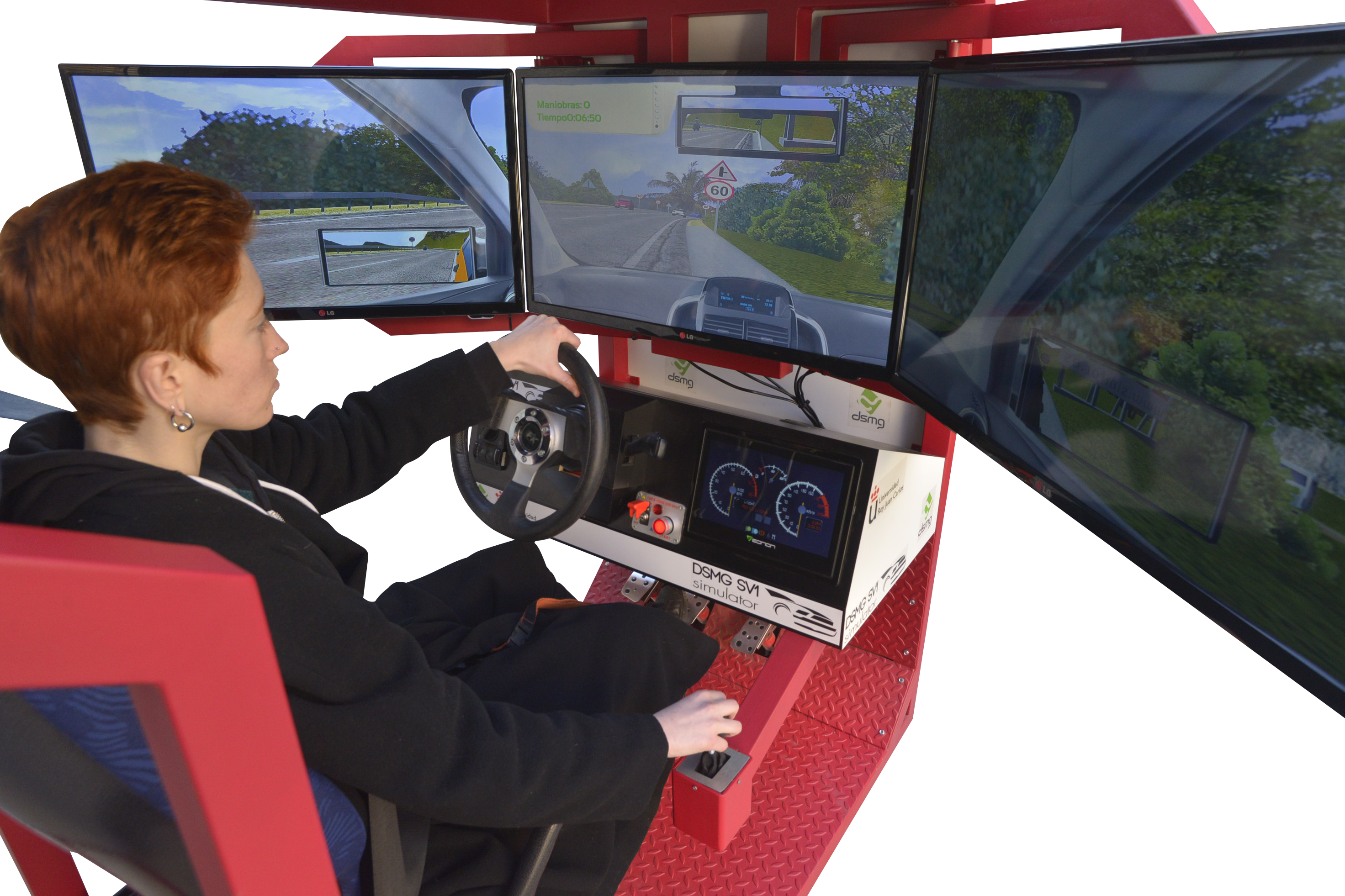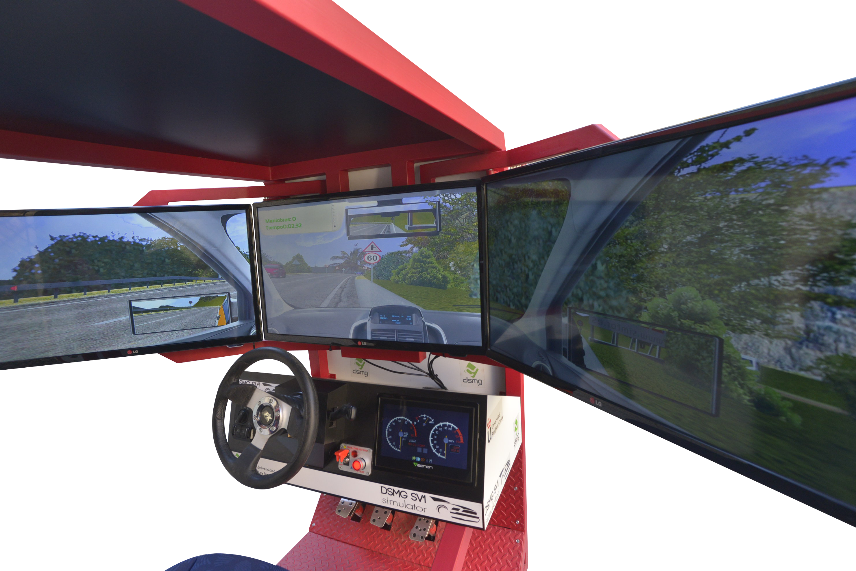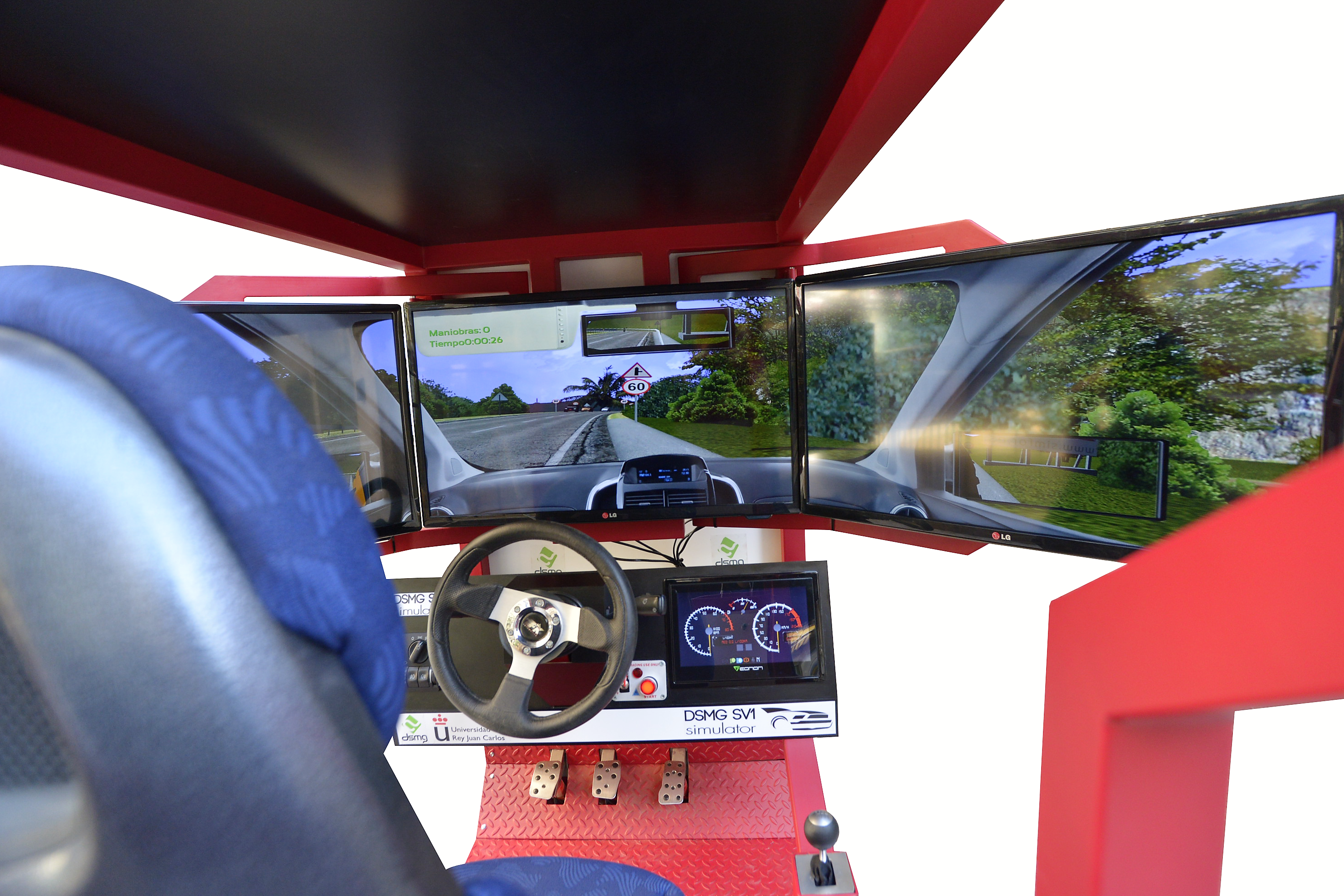 En cuanto a ergonomía y al espacio interior, asientos reales regulables, 3 pantallas de plasma de gran formato, (32 pulgadas), orientadas en ángulos precisos para que la sensación de movimiento sea real a través de la visión lateral,